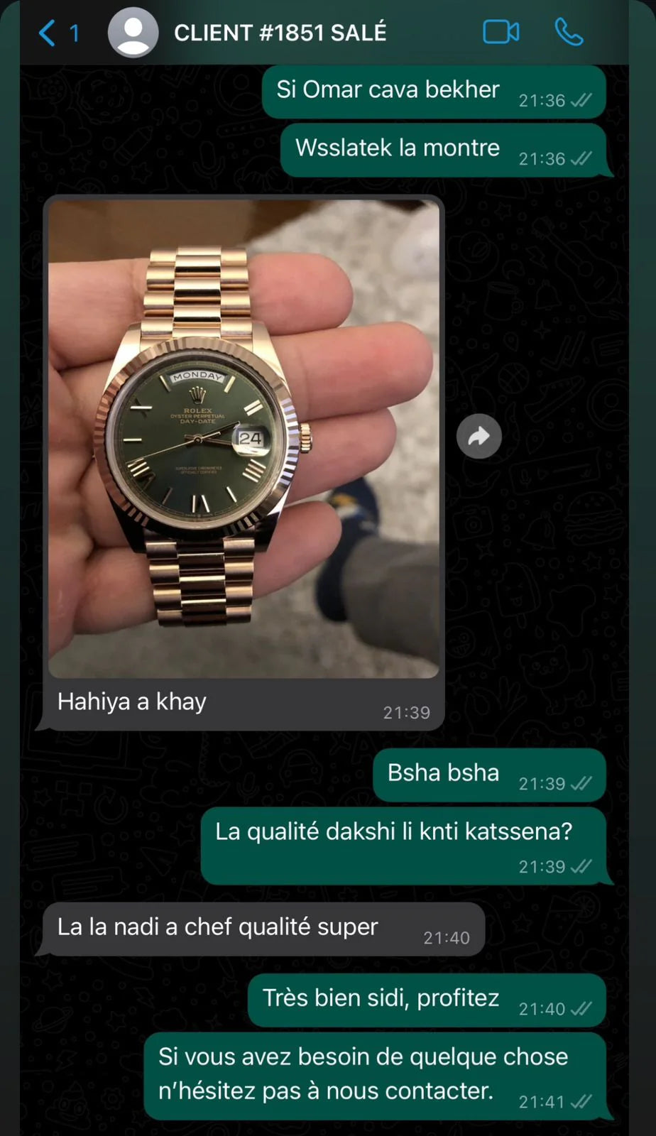 Le paiement s'effectue en espèces à la livraison, après avoir vérifié le colis. Vous pouvez régler le montant total de votre commande directement au livreur au moment de la livraison de votre montre de luxe, une fois que vous avez eu l'occasion de vérifier que le colis est conforme à vos attentes.