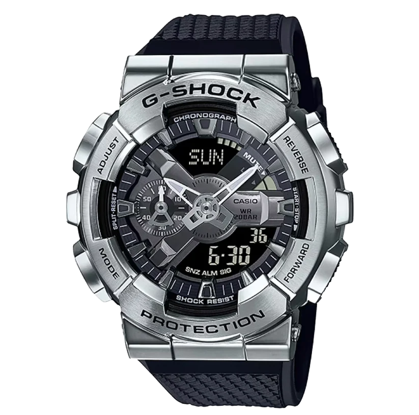 Inspirée des montres robustes G-SHOCK toujours en quête de plus de solidité, la série GM-110 est basée sur le modèle combiné GA-110 à affichage mixte numérique-analogique de la gamme sobre et tendance Metal Covered à lunette en acier inoxydable. Le cadran possède une forme en Y caractéristique qui conserve une texture métallique, tandis que l'affichage numérique et les aiguilles des heures et des minutes sont disposés de manière harmonieuse pour améliorer la visibilité.