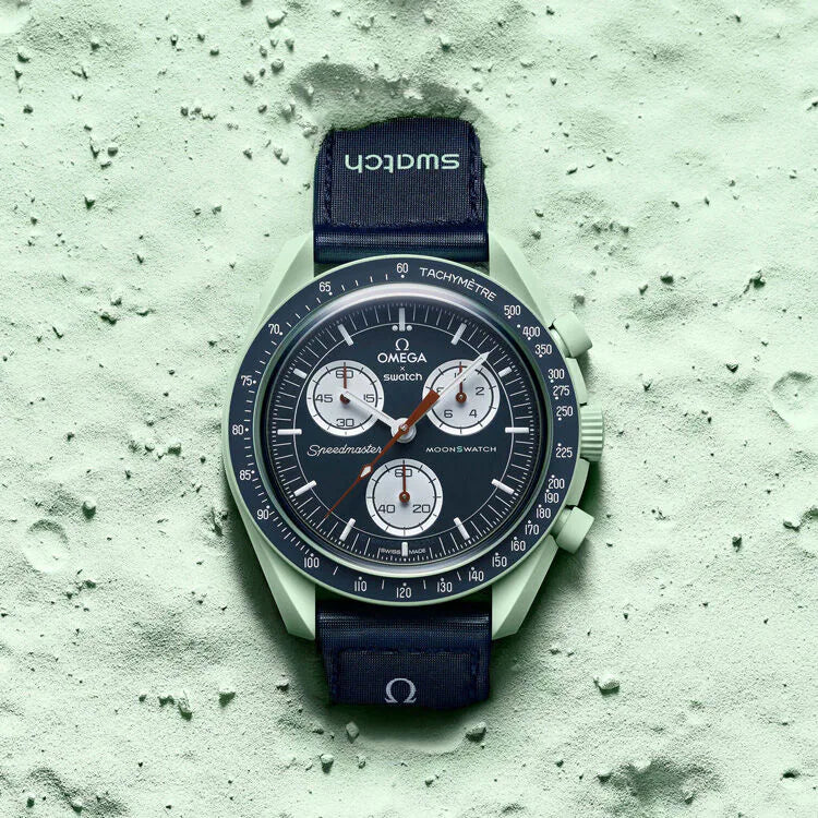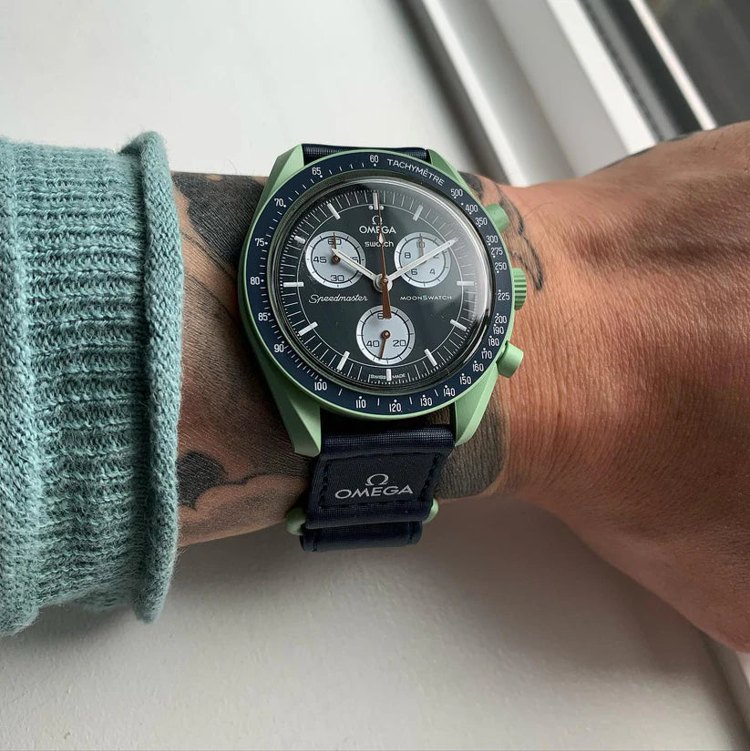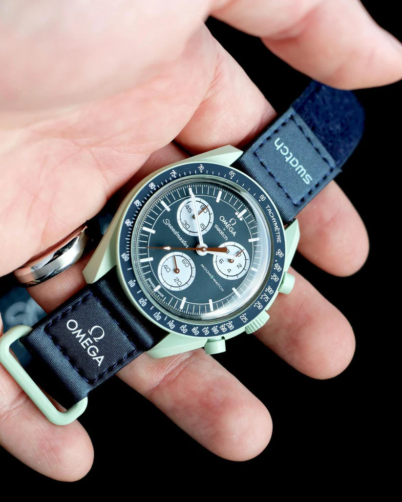 Les éco-astronautes vont adorer cette montre verte avec son bracelet VELCRO© bleu marine. L’aiguille des secondes du chronographe et les aiguilles des compteurs sont marron. Les compteurs sont blancs, tout comme l’échelle tachymétrique sur le fond bleu de la lunette. Tous les cadrans portent la marque OMEGA X SWATCH, ainsi que le logo emblématique Speedmaster et le nouveau logo MoonSwatch. La construction du verre, le S «caché» intégré au centre du cristal, le motif circulaire fin et sophistiqué sur l’anneau extérieur du cadran et les compteurs, la construction des bordures à la fois nette et lisse, le détail typique du «point sur 90» sur la lunette à échelle tachymétrique et, bien sûr, le toucher unique du biocéramique sont communs à tous les modèles et représentent l’attachement de Swatch pour le détail. Les aiguilles des heures, des minutes et des secondes du chronographe, ainsi que les marqueurs d’heures, sont dotés du revêtement Super-LumiNova pour une brillance parfaite dans l’obscurité. SO33G100