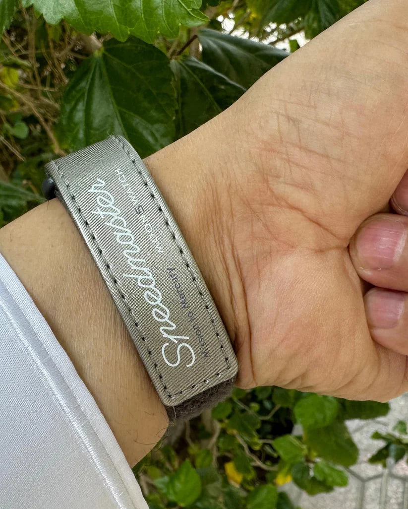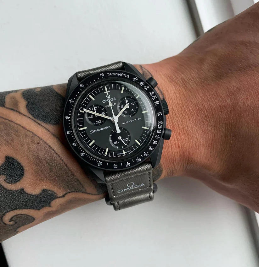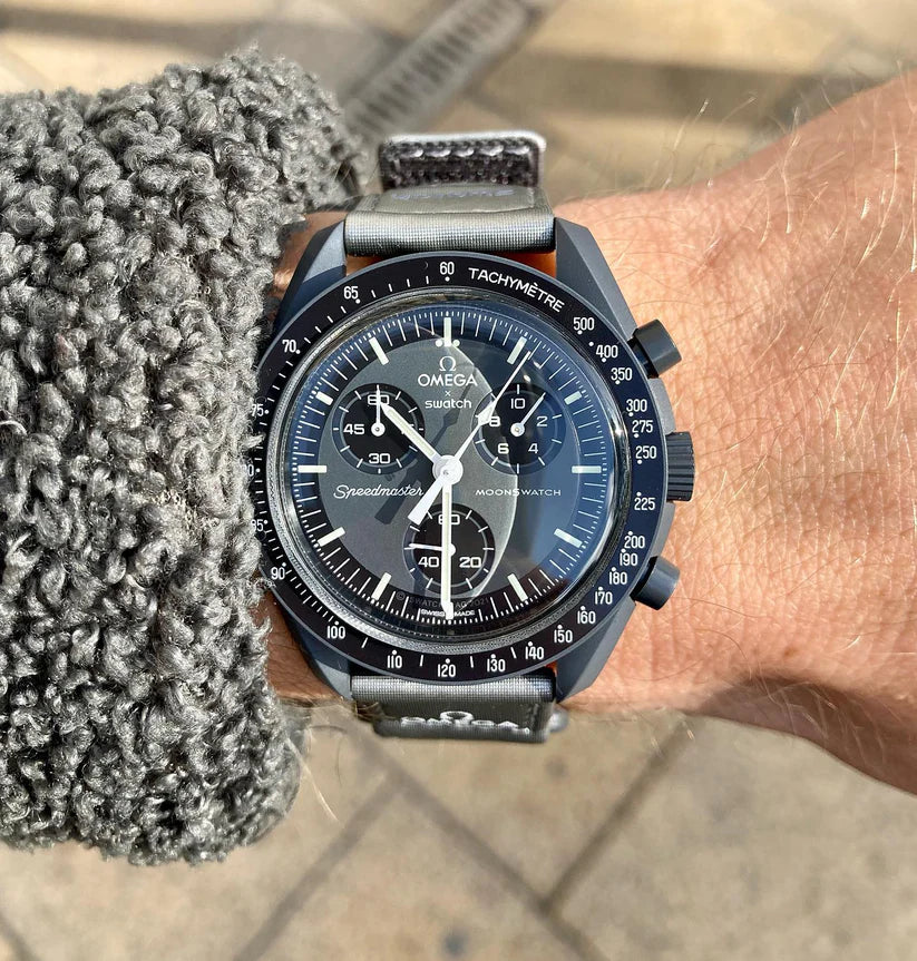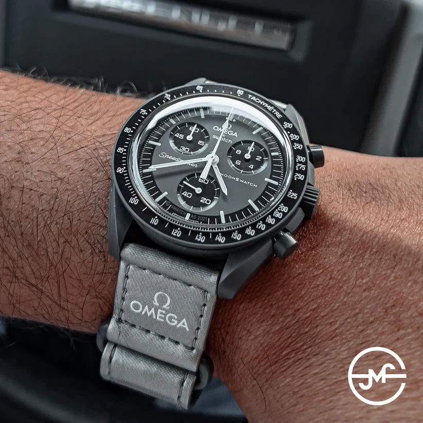 Avec sa couleur gris foncé intense et son bracelet VELCRO© gris métallisé, cette montre ne plaisante pas. L’aiguille des secondes du chronographe, les aiguilles des compteurs et l’échelle tachymétrique sont blanches. Les compteurs et le fond de la lunette sont noirs. Tous les cadrans portent la marque OMEGA X SWATCH, ainsi que le logo emblématique Speedmaster et le nouveau logo MoonSwatch. La construction du verre, le S «caché» intégré au centre du cristal, le motif circulaire fin et sophistiqué sur l’anneau extérieur du cadran et les compteurs, la construction des bordures à la fois nette et lisse, le détail typique du «point sur 90» sur la lunette à échelle tachymétrique et, bien sûr, le toucher unique du biocéramique sont communs à tous les modèles et représentent l’attachement de Swatch pour le détail. Les aiguilles des heures, des minutes et des secondes du chronographe, ainsi que les marqueurs d’heures, sont dotés du revêtement Super-LumiNova pour une brillance parfaite dans l’obscurité. SO33A100
