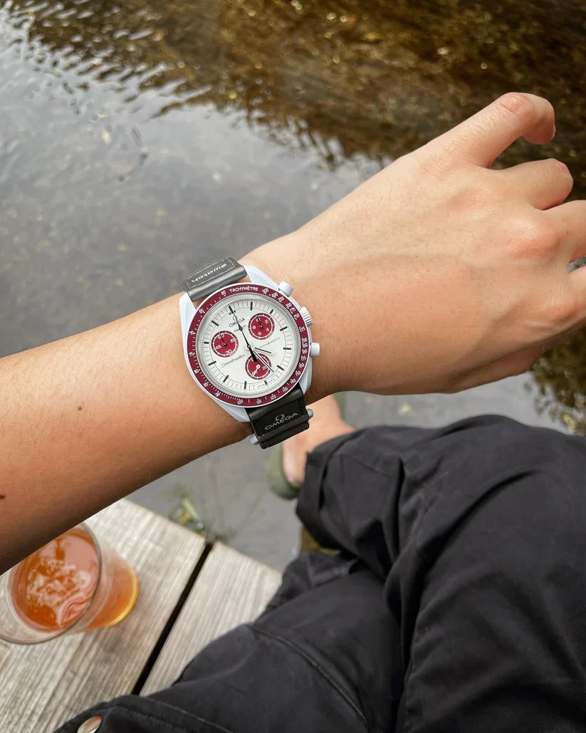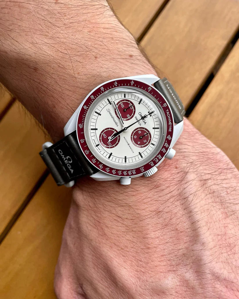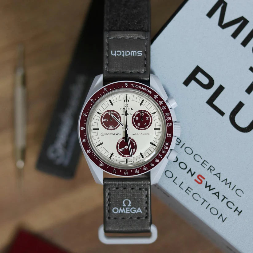 Sur cette montre, les tons gris clair contrastent avec le bracelet VELCRO© gris foncé. L’aiguille des secondes du chronographe et les aiguilles des compteurs sont noires, tandis que les compteurs et le fond de la lunette sont dans deux tons bordeaux. Tous les cadrans portent la marque OMEGA X SWATCH, ainsi que le logo emblématique Speedmaster et le nouveau logo MoonSwatch. La construction du verre, le S «caché» intégré au centre du cristal, le motif circulaire fin et sophistiqué sur l’anneau extérieur du cadran et les compteurs, la construction des bordures à la fois nette et lisse, le détail typique du «point sur 90» sur la lunette à échelle tachymétrique et, bien sûr, le toucher unique du biocéramique sont communs à tous les modèles et représentent l’attachement de Swatch pour le détail. SO33M101
