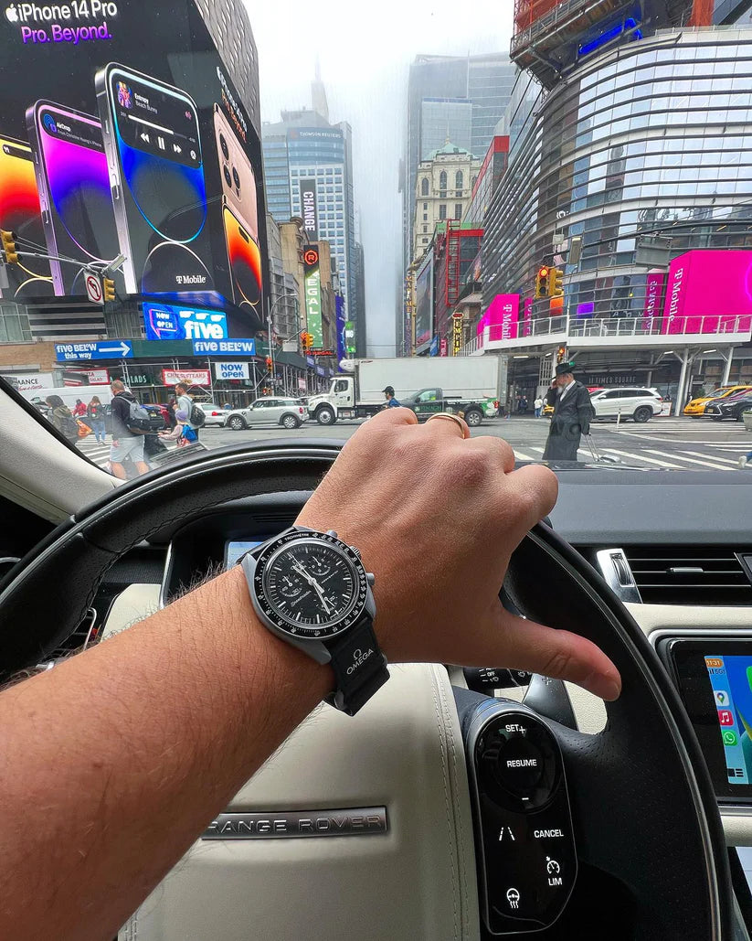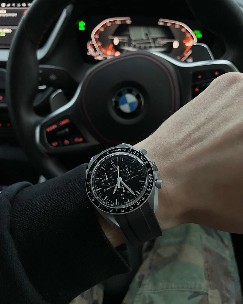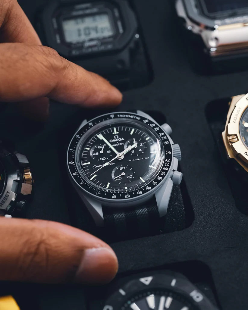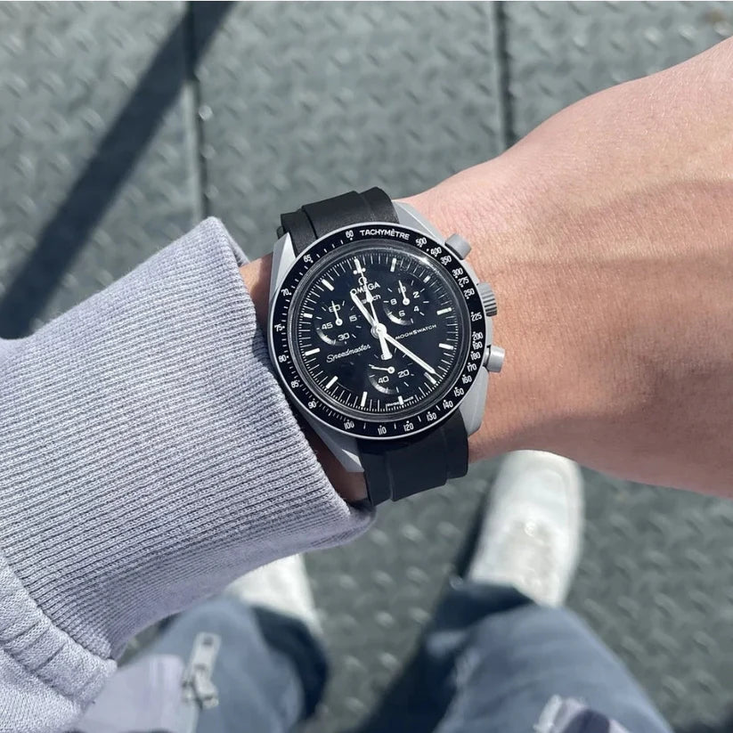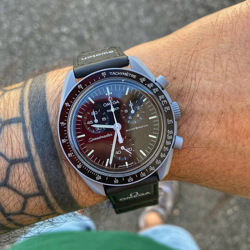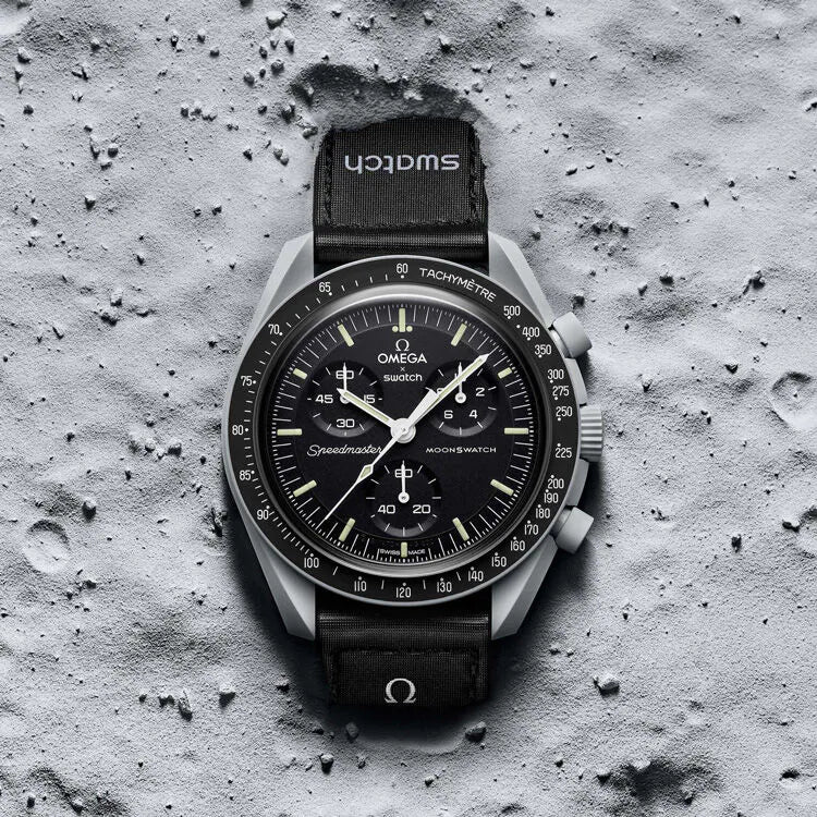 Ce modèle gris acier, doté d’un bracelet noir VELCRO©, est (presque) authentique. Toutes les aiguilles et l’échelle tachymétrique sont blanches, comme sur la Moonwatch originale. Tous les cadrans portent la marque OMEGA X SWATCH, ainsi que le logo emblématique Speedmaster et le nouveau logo MoonSwatch. La construction du verre, le S «caché» intégré au centre du cristal, le motif circulaire fin et sophistiqué sur l’anneau extérieur du cadran et les compteurs, la construction des bordures à la fois nette et lisse, le détail typique du «point sur 90» sur la lunette à échelle tachymétrique et, bien sûr, le toucher unique du biocéramique sont communs à tous les modèles et représentent l’attachement de Swatch pour le détail. Les aiguilles des heures, des minutes et des secondes du chronographe, ainsi que les marqueurs d’heures, sont dotés du revêtement Super-LumiNova pour une brillance parfaite dans l’obscurité. SO33M100