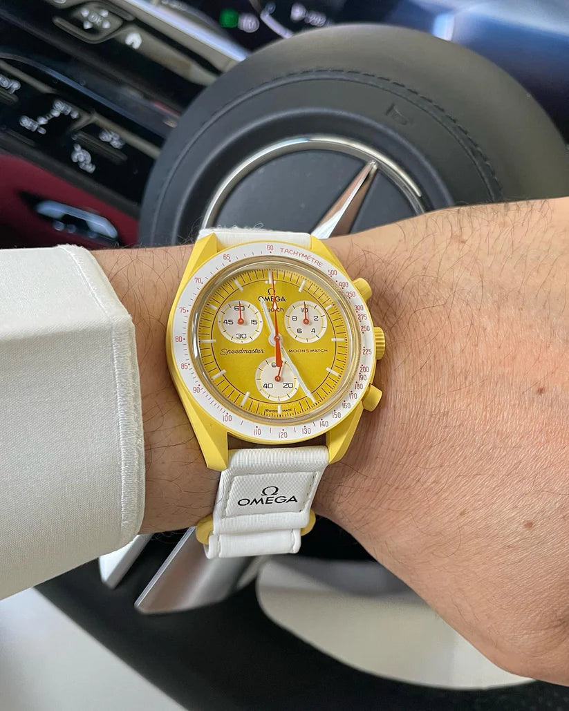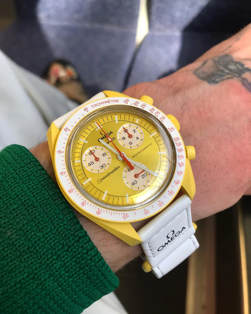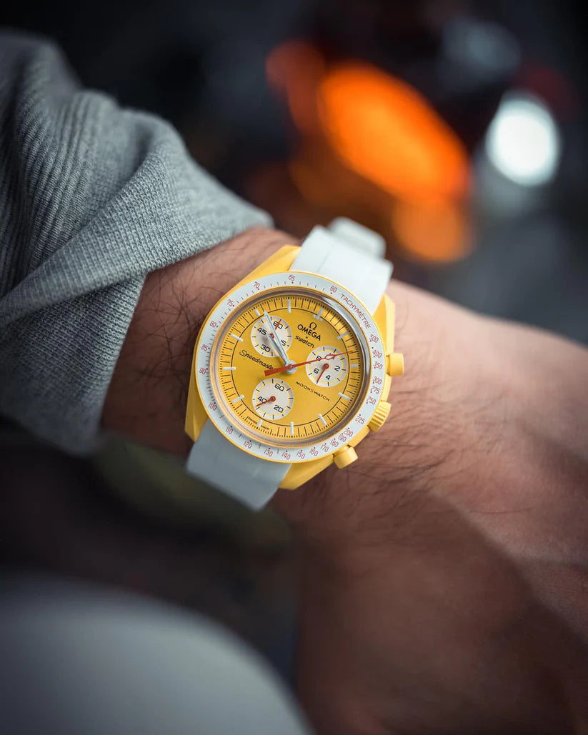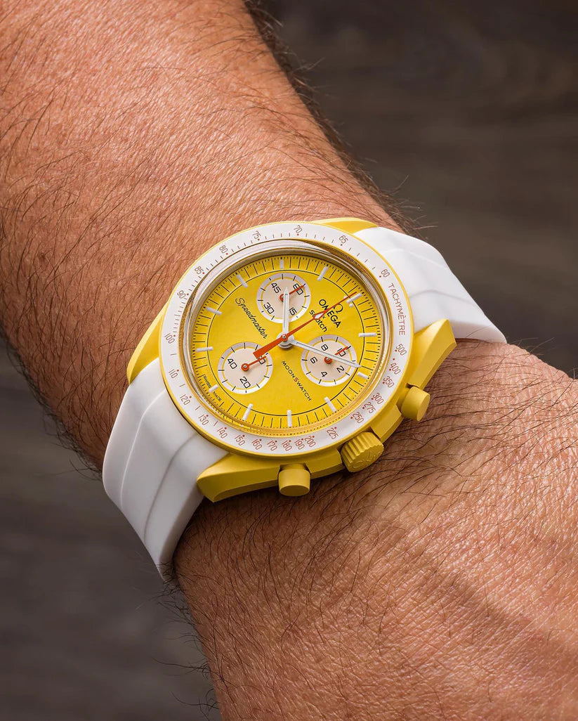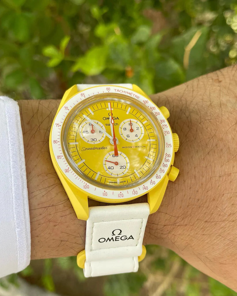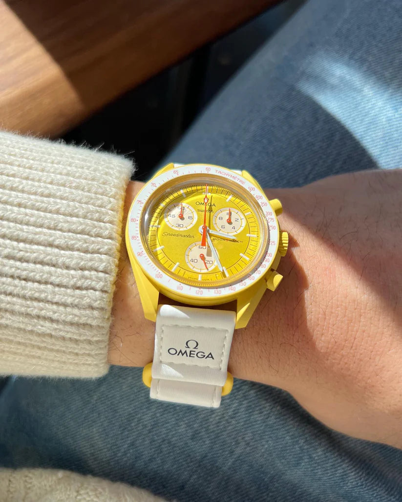 Cette étoile jaune éclatante possède un cadran sophistiqué brossé soleil et un bracelet VELCRO© blanc. L’aiguille des secondes du chronographe, les aiguilles des compteurs et l’échelle tachymétrique sont orange. Les compteurs et le fond de la lunette sont blancs. Tous les cadrans portent la marque OMEGA X SWATCH, ainsi que le logo emblématique Speedmaster et le nouveau logo MoonSwatch. La construction du verre, le S «caché» intégré au centre du cristal, le motif circulaire fin et sophistiqué sur l’anneau extérieur du cadran et les compteurs, la construction des bordures à la fois nette et lisse, le détail typique du «point sur 90» sur la lunette à échelle tachymétrique et, bien sûr, le toucher unique du biocéramique sont communs à tous les modèles et représentent l’attachement de Swatch pour le détail. Les aiguilles des heures, des minutes et des secondes du chronographe, ainsi que les marqueurs d’heures, sont dotés du revêtement Super-LumiNova pour une brillance parfaite dans l’obscurité. SO33J100