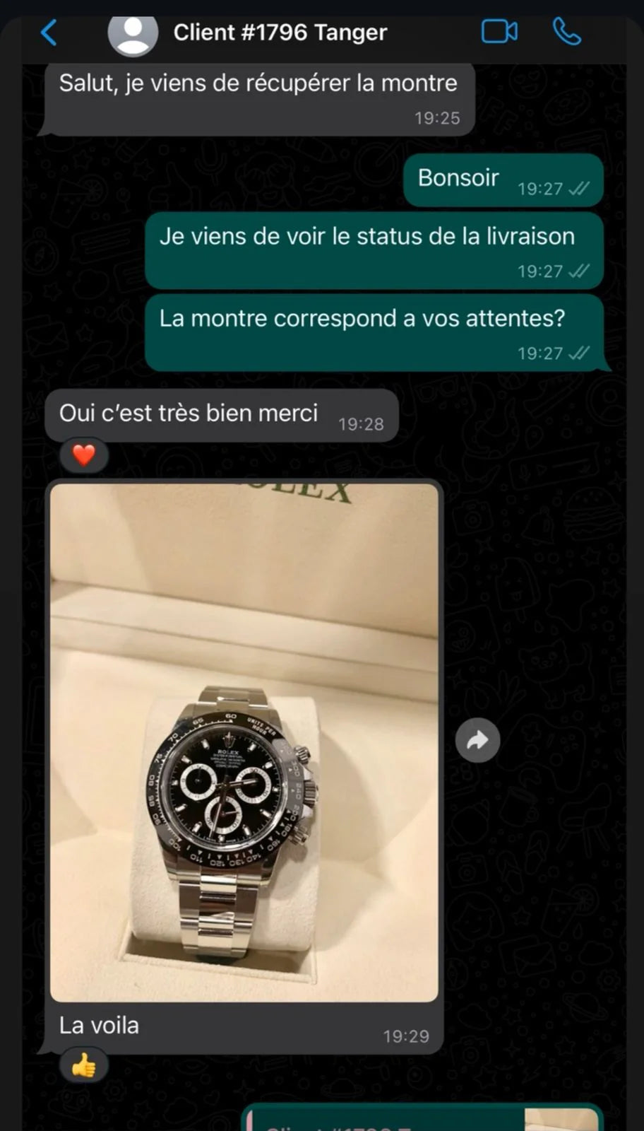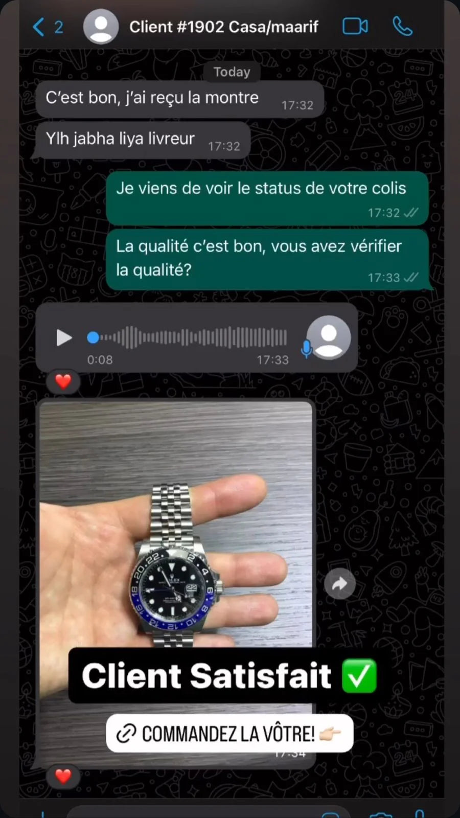 Le paiement s'effectue en espèces à la livraison, après avoir vérifié le colis. Vous pouvez régler le montant total de votre commande directement au livreur au moment de la livraison de votre montre de luxe, une fois que vous avez eu l'occasion de vérifier que le colis est conforme à vos attentes.